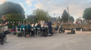 The band’s first public engagement after Covid was at the Old Neighbourhood pub in Chalford. We were invited to provide the entertainment to the throngs celebrating the Queen’s Platinum Jubilee. It gave us the opportunity to play to a large and supportive audience with an eclectic selection of music, from marches to classics, with a plethora of solo items included. The evening was rounded off with a transcription of the bagpipe tune Diu Regnare and fanfare to accompany the lighting of the Jubilee Beacon.